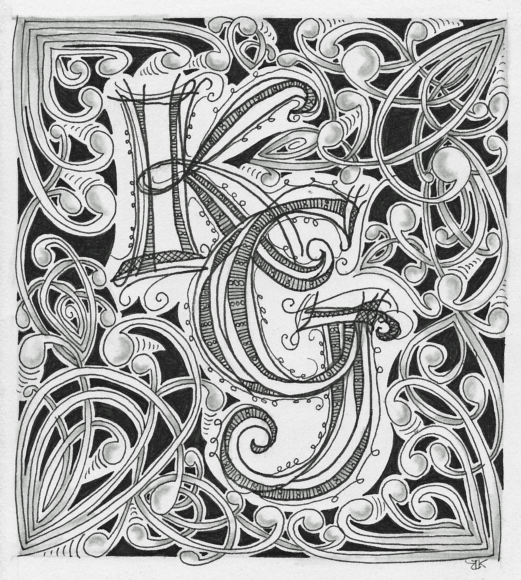 One thing has been nagging at me as we begin to tackle the small details of this wedding. I was asked to design the invitations and have most of this done, but nothing so far that was truly unique to the couple. I had done the artwork for our oldest daughter’s wedding program and they were very specifically designed to fit her. But, as I said, the girls are very different and nothing has come to mind for her. Finally, I suggested a wedding logo made up their combined initials to be used on the favors and save the date cards. Bride and Groom loved the idea and I was off and running. Of course, the final result is Zentangle inspired.