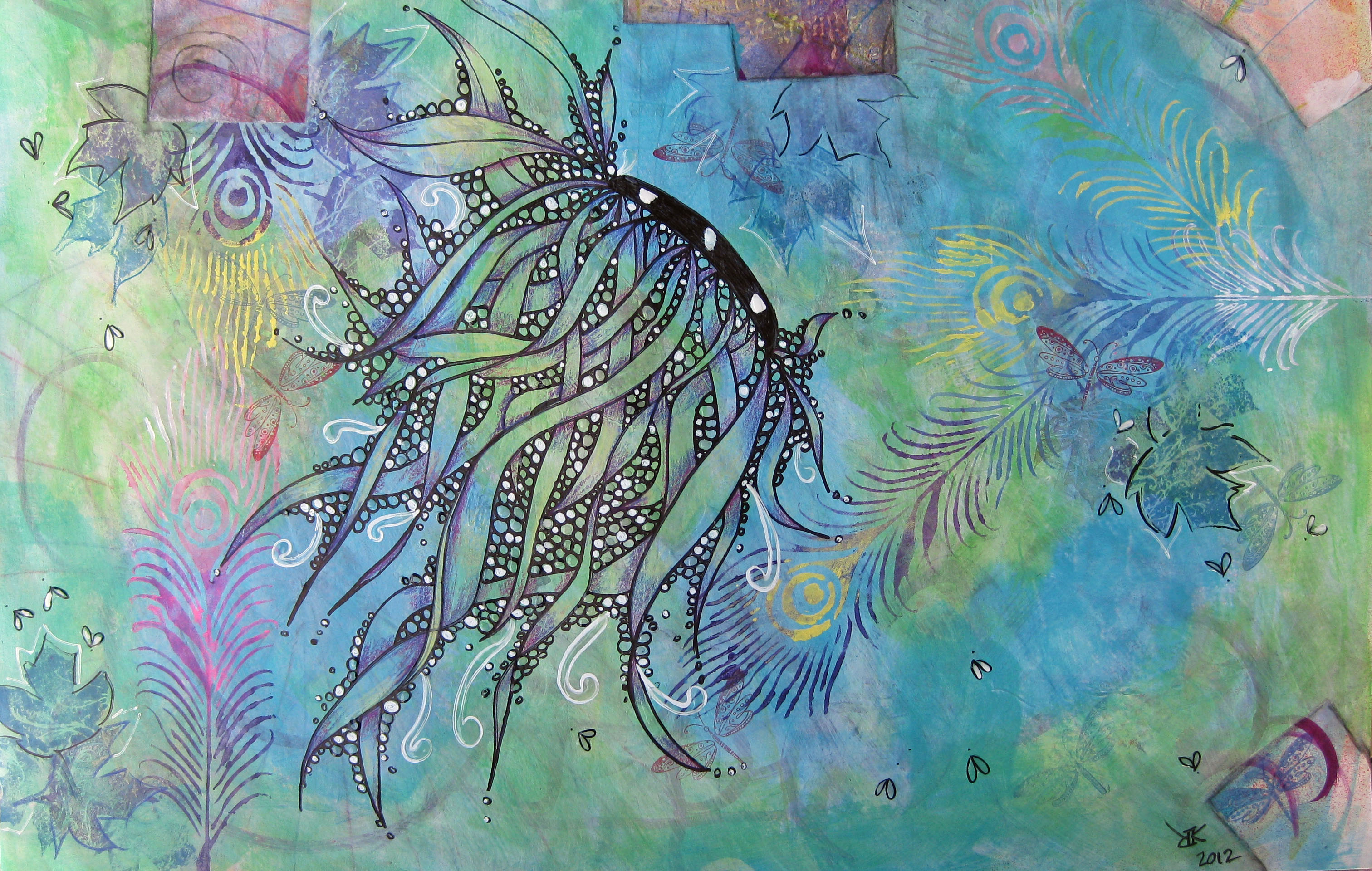 What a great weekend I had with my grandchildren! We got off our “art class schedule” when their mom had to have gallbladder surgery, though they asked often when we were going to do our art again. Mom returned to work on Friday, so we had a full weekend together. We pulled out our supplies on Friday night, wrapped the table in our ugly vinyl tablecloth and dabbled a bit. A visit to Michael’s and the grocery store on Saturday morning for more supplies and sustenance. Then lots of fun the rest of the day and most of Sunday. Both kids completed one piece and have another much larger piece in progress. I also revisited a very ugly background I had done and saved it and then added a little Zentangle for good measure – I can once again hold my head up. We all agree it is much improved.