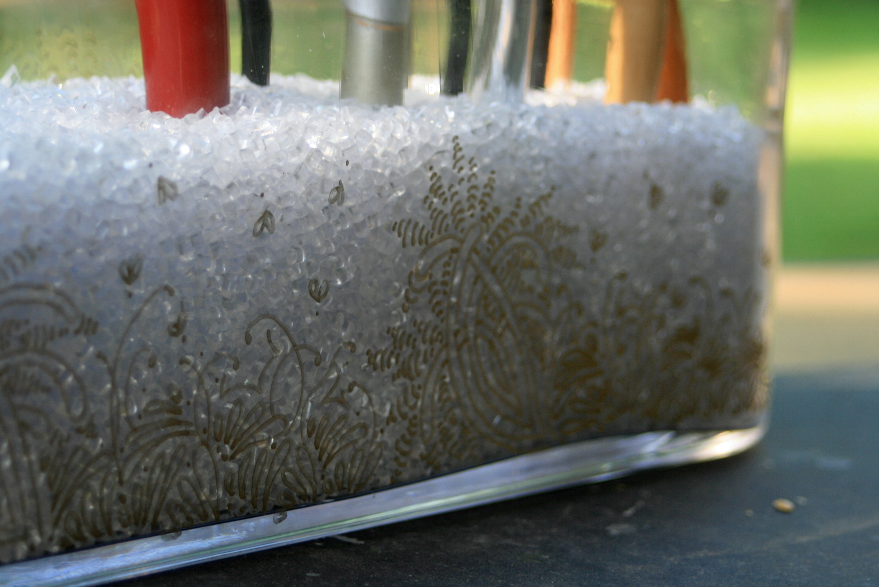 - The pen I used was a Sharpie Oil Based Marker – Extra Fine Point – Gold. I really wanted the extra fine point and had great luck with the oil-based Sharpies on my file cabinet seen here. If I were to do this again, I would choose black instead of gold. As you can see from the photos, the metallic is difficult to see on the clear glass with the filler I used.