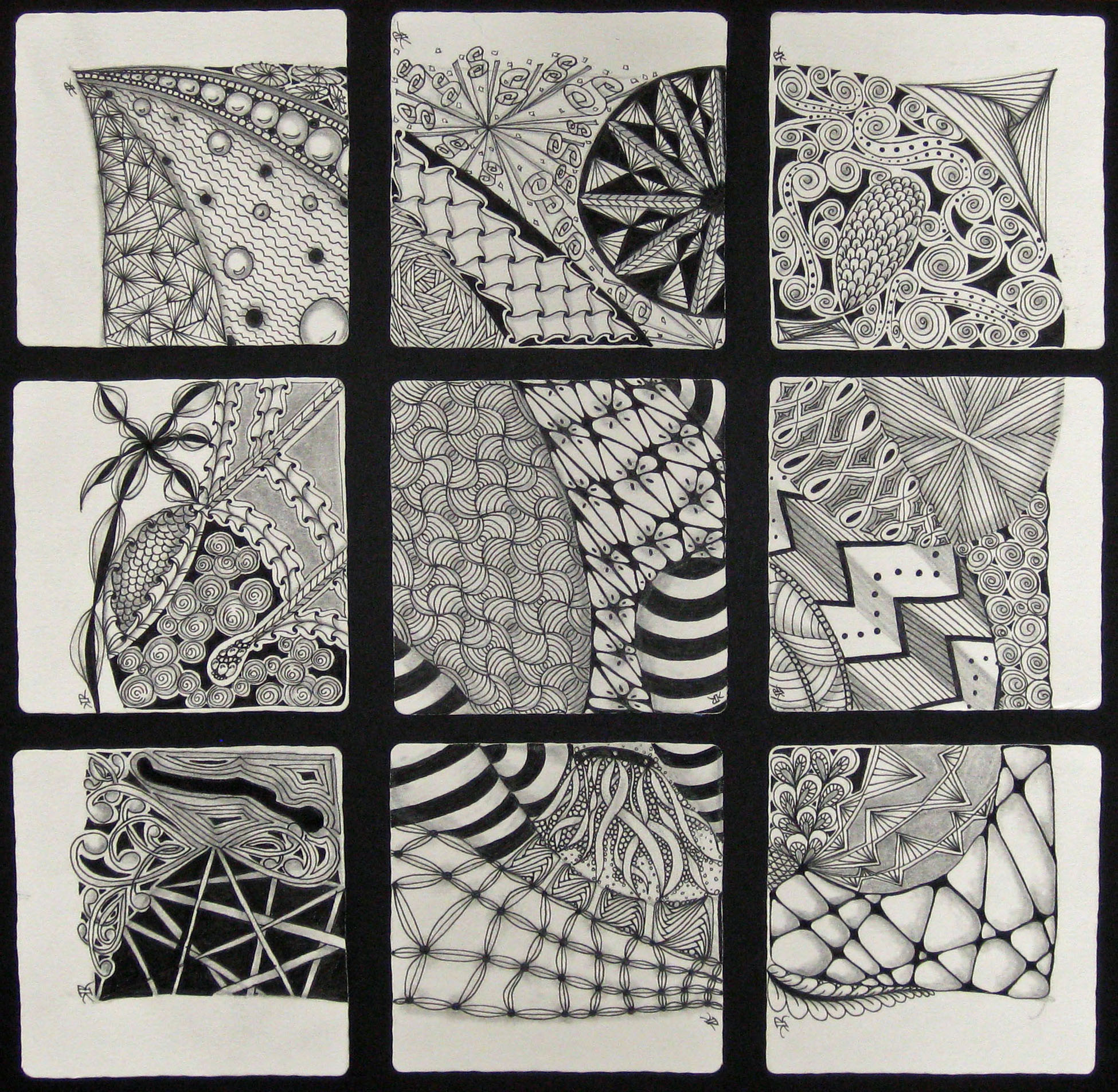Now that I’m back home, I have been taking time to finish all those tiles started at the seminar. There were so many with the beginnings of tangles to learn techniques, tangle combinations a little outside the box and just half completed because we were moving on to something else. Maria taught a cute little frame that I will definitely use over and over. I’m showing the tile and a digital version with my wedding pic in it. You will likely recognize a “new” friend in these tiles. Be looking for the instructions in an upcoming Zentangle newsletter or if you can’t wait, find a CZT IX and take a class. While I didn’t take very many pictures, my tiles serve as my memories for this wonderful time in Providence. I hope you enjoy…