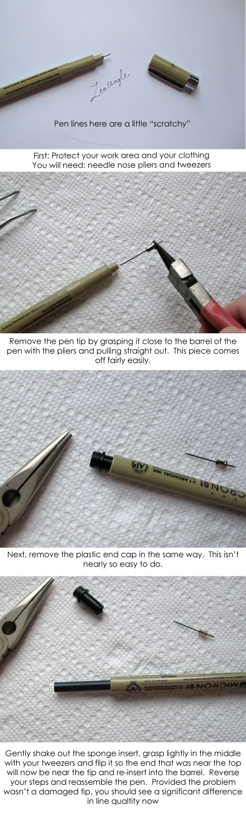 Even if you follow all this advice, there will come a time when your pen really does run out of ink. You will notice scratchy lines and some skipping – sometimes I like the look, but not always. There is a way to get a little more mileage out of your Sakura pen. Rick shared this tip with us in my first CZT training and I recently found myself in desperate need of just a little more purple ink for my Sakura Identi-Pen to finish a pair of Tangled Toms. It works with both the microns and the Identi-Pen. Below are step-by-step instructions. I hope these tips and tricks prove useful and long live YOUR Sakura pens too!