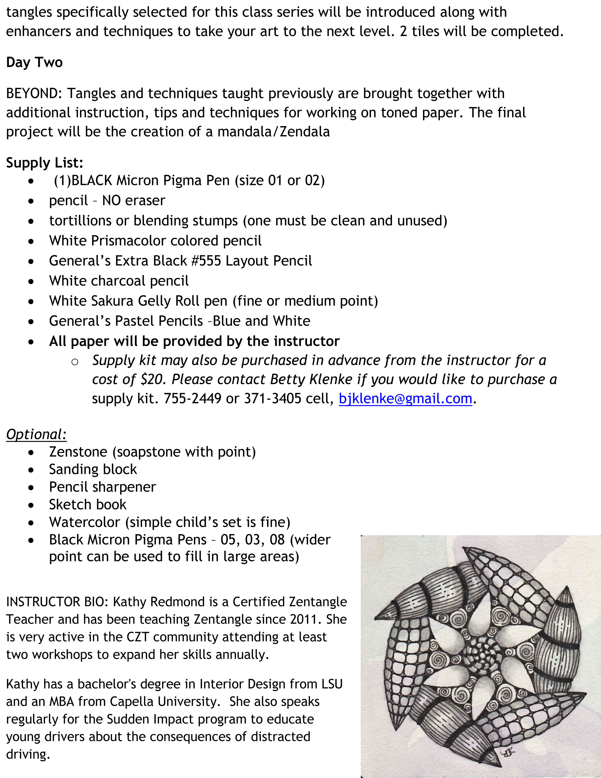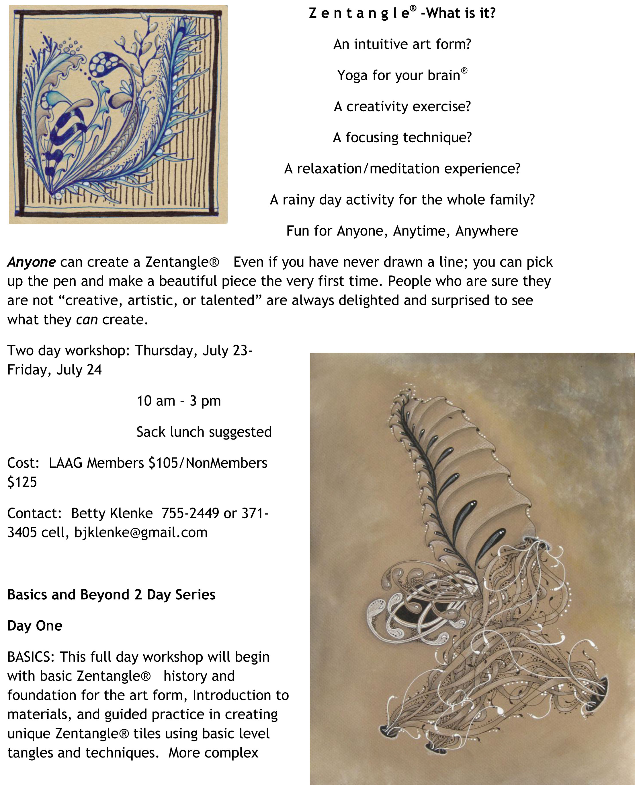 I have taken a lot of time lately to hone my Zentangle skills and will be sharing some new techniques in an upcoming workshop. This class is sponsored by the Louisiana Art and Artists Guild and will be held at their studio in Baton Rouge, Louisiana. Here are the details: